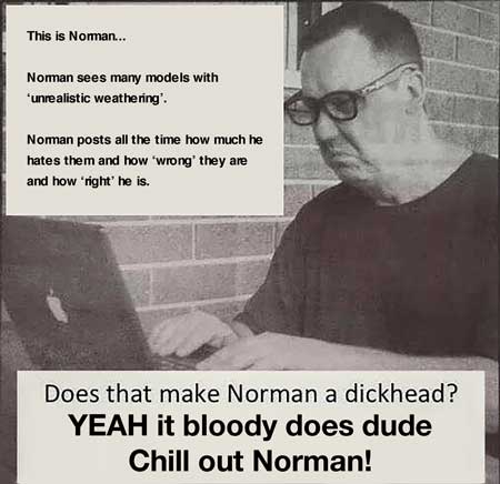 Now truly, I don’t wish to point out individuals at all, as we’re all in this hobby together, and I get what some people are trying to achieve with their posts. As in pushing others out of the general comfort zone of doing the same type of thing over and over. But the whole ‘I’m right and you are wrong’ thing really has to stop. Especially when talking about ‘weathering’ or even paint tones. Because in the end, you are ruining other people’s day and, if you haven’t realised it, whatever side you are on, smearing it over everyone’s face like a shit-throwing baboon makes you look like… well it actually makes you exactly that.