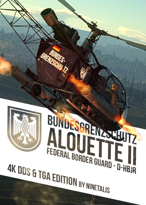 Here is another skin for the Alouette II of the Bundesgrenzschutz (West German Federal Border Guard) aircraft carrying the D-HBJR registration.Now you can prevent any pesky foreign intruders from taking your job on the Fulda map in both 4K DDS and TGA glory. I also took the liberty to change the gun belt bullets to an orange colour to respresent some type of training ammo, just for the giggles.