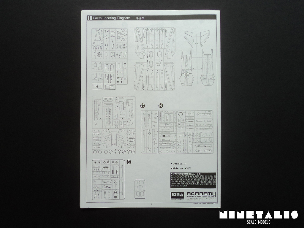 Just like the large amount of frames, their is also a rather large presence of printed materials. Aside from an instruction sheet, we get an A3 sized ‘poster’ showing off the six paint schemes on one side and the stencil placements on the other. As I’ve just mentioned stencils, it’s not surprising that we get a quite large decal sheet that is about the size of an A4 sheet of paper. Last is the usual Academy warning sheet and a small leaflet which explains how to use decals and place them onto your model.