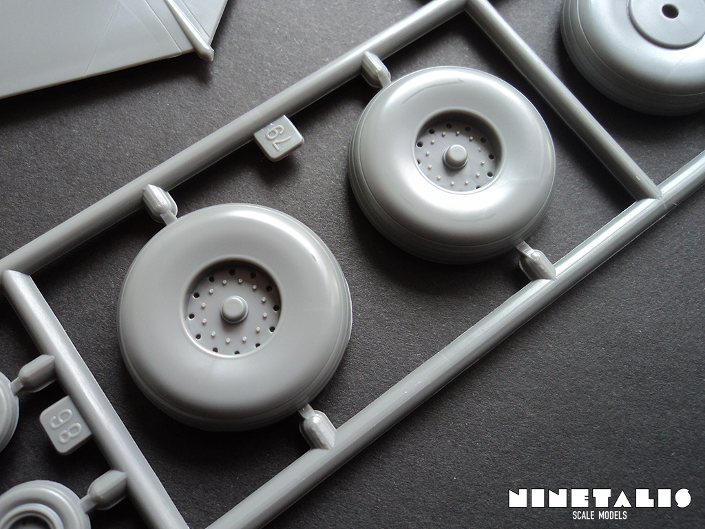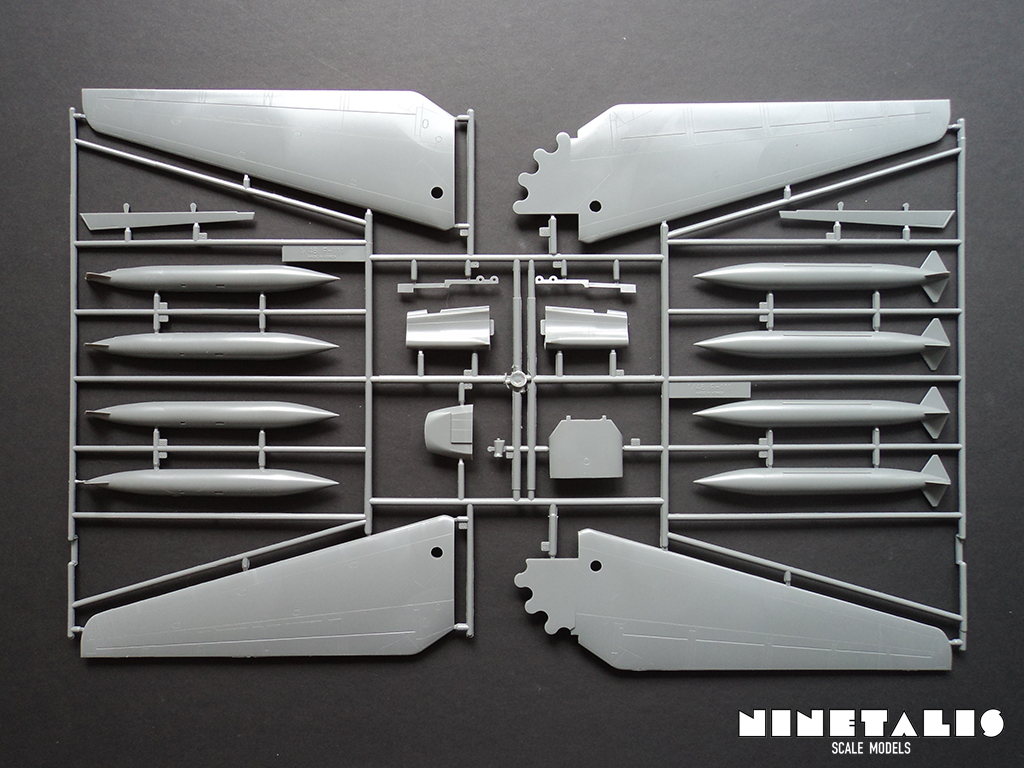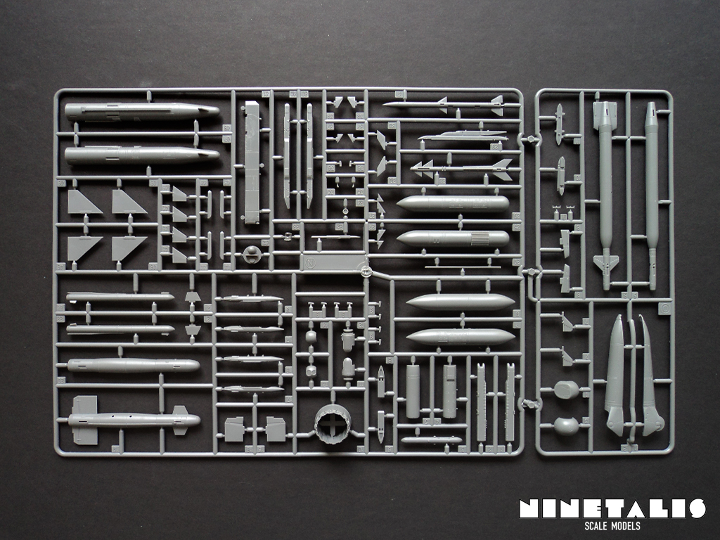 The second sprue holds parts like the forward fuselage area, the wheels, forward landing gear bay, the hard points, horizontal stabilisers and exhausts. We can find both raised and recessed panel lines. With the exhausts it becomes clear that there is no internal engine included with the kit. This is definitely something (and probably the only thing) that a serious builder will have to address if he or she is planning to build a top notch model.