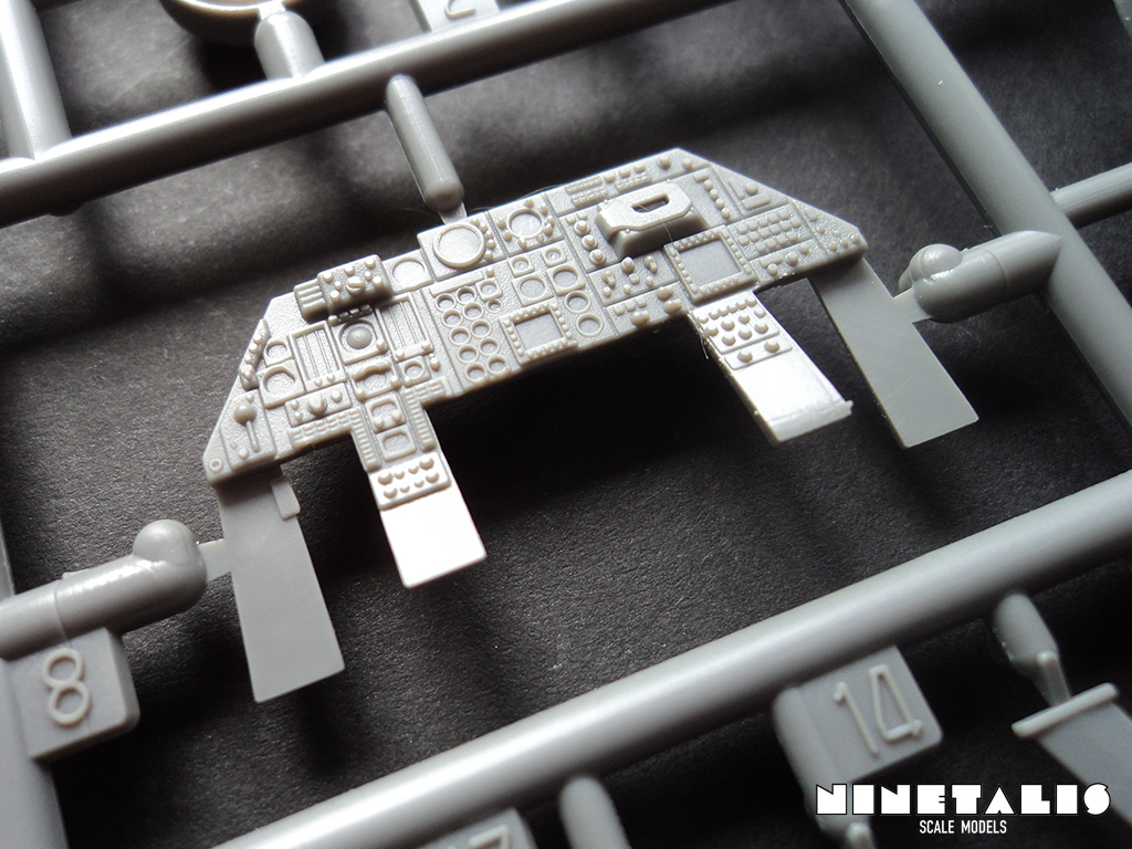 The first sprue (if you can call it that) feature just four parts, which are the upper and lower fuselage and both halves of the tail section. The parts feature recessed panel lines and the lower fuselage is outfitted with a detailed landing gear bay. Inside the landing bay we can find much details like cables, generators and much more.