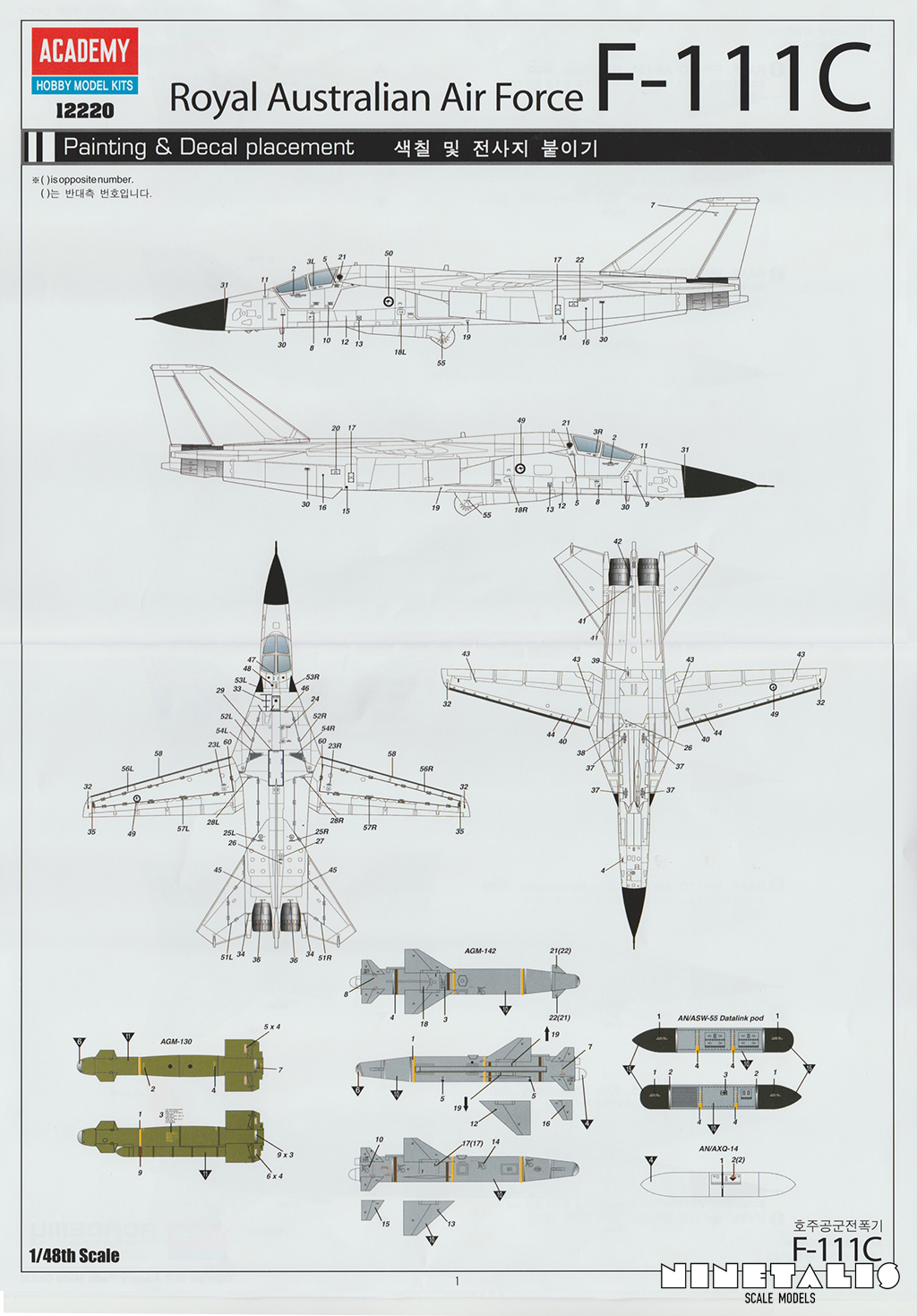 Academy’s instruction sheet with this F-111 is extensive and shows all the necessary steps to complete the F-111, including the ones for the armament that comes with it. These are obviously updated since the last release of their F-111C because duh, new parts, but also because I’ve seen the previous instruction sheet myself, which sports completely different illustrations consisting of thicker, cruder lines.