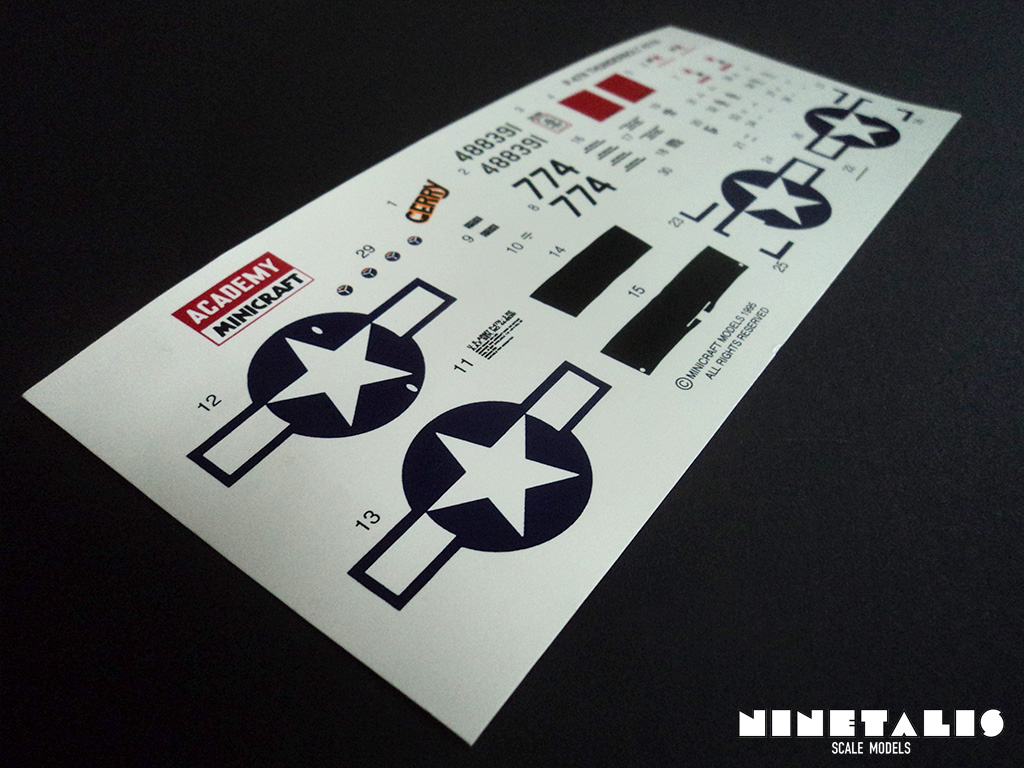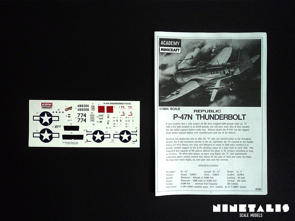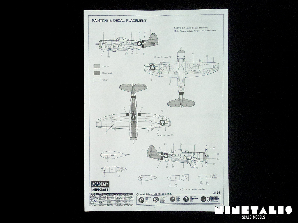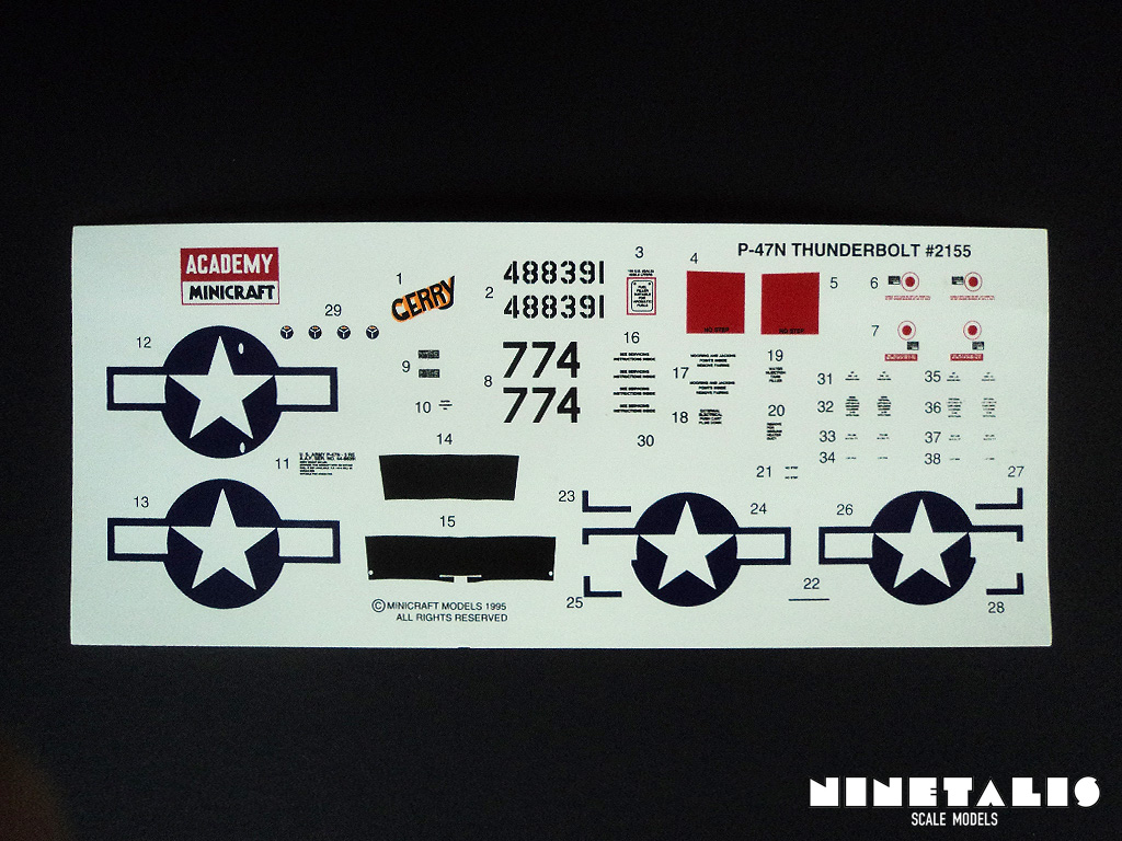 For those who are interested however, the markings provided depict a P-47N-5-RE from the 456th fighter squadron, 414th fighter group based at Iwo Jima during August 1945, with a typographical ‘Gerry’ nose art in black letters with yellow shadows. The aircraft is painted in overal natural metal finish with olive drab anti glare panels and a black band around the empennage, bordering the squadron’s bright yellow tail and a yellow band on the front of the engine cowling.