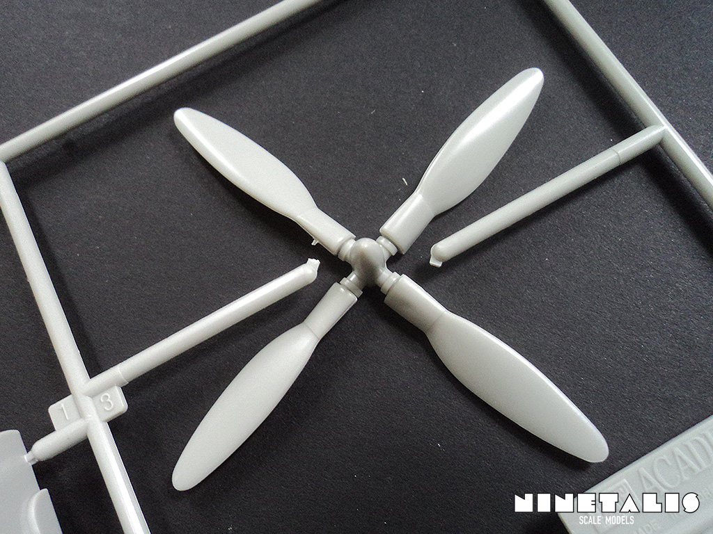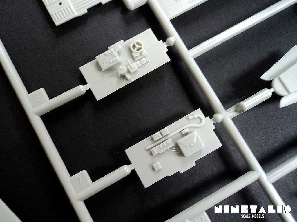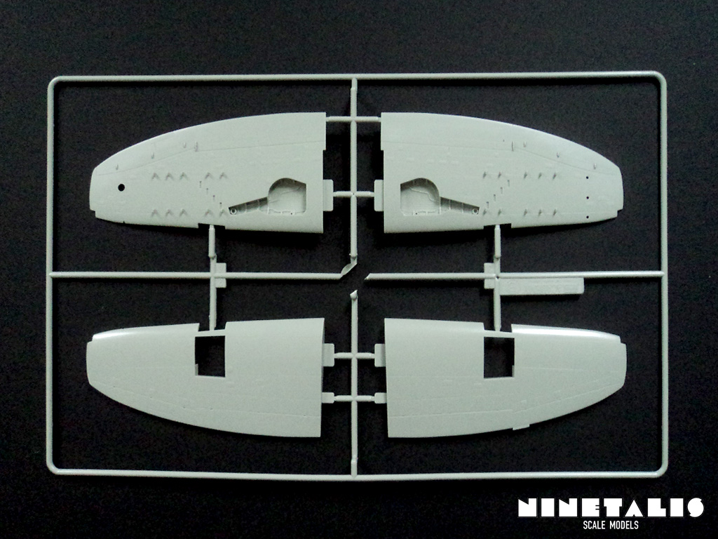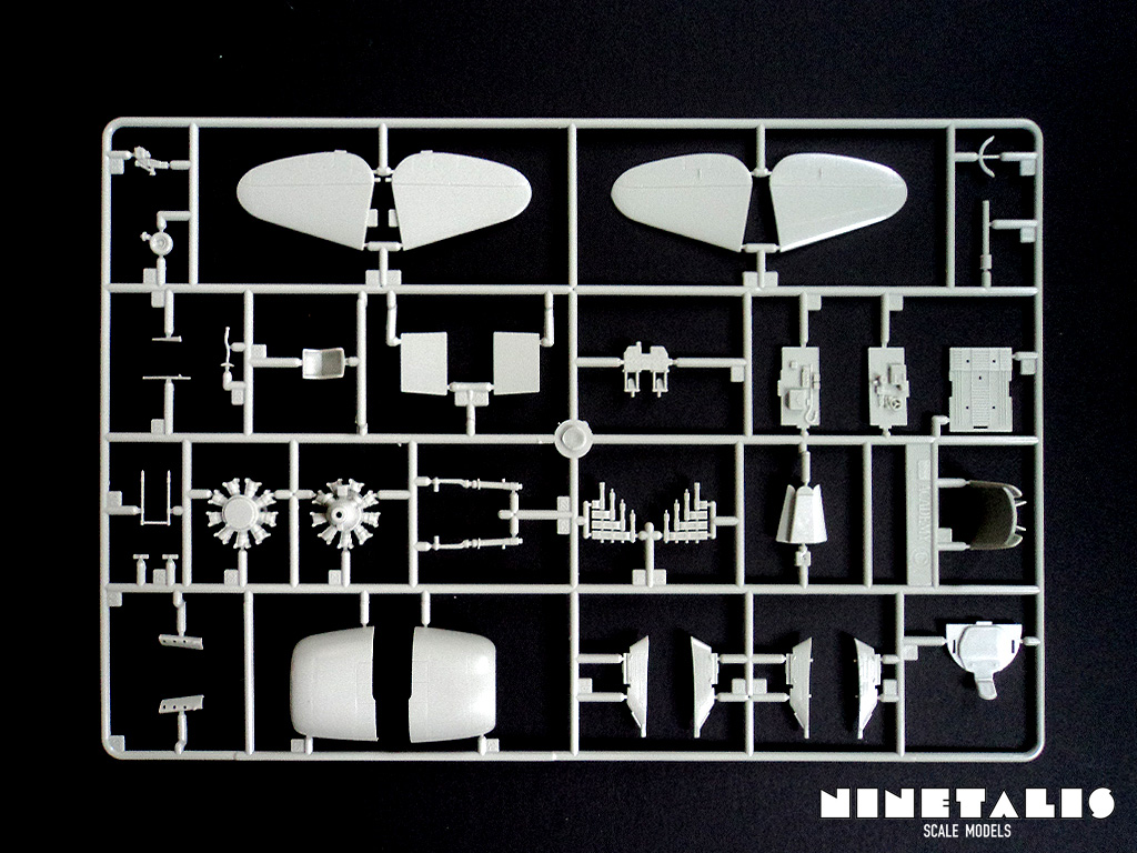 On the third sprue we can find pretty much everything else of the plane itself except for the wheels. This includes the cockpit that is made up from eight pieces, which is not the best cockpit out there, but compared to some of their other kits, it is actually pretty good, as I’ve seen much worse like the cockpit of their P-40C, P-36 or Mirage IIIR, who are all reboxed kits from other companies.