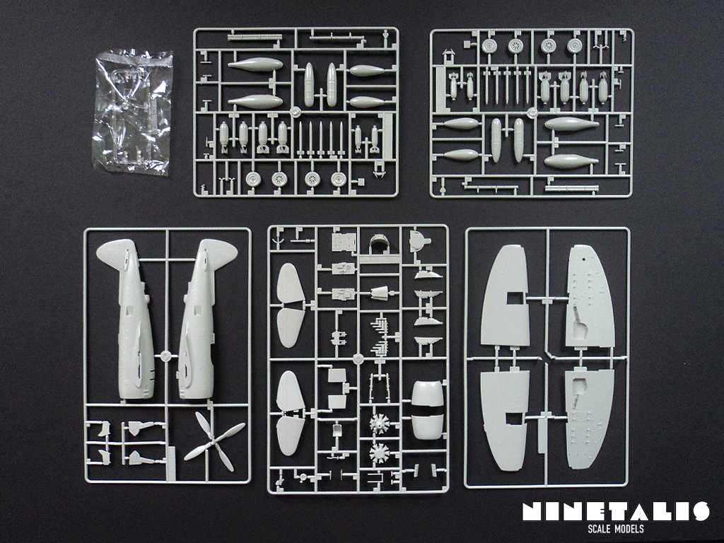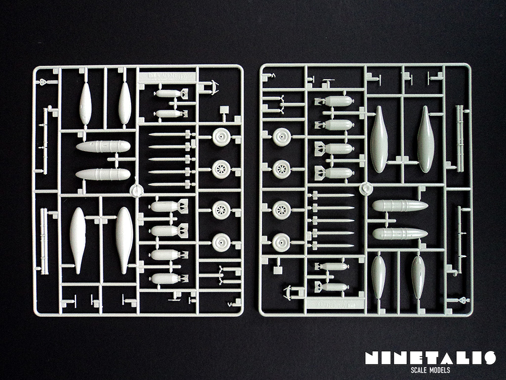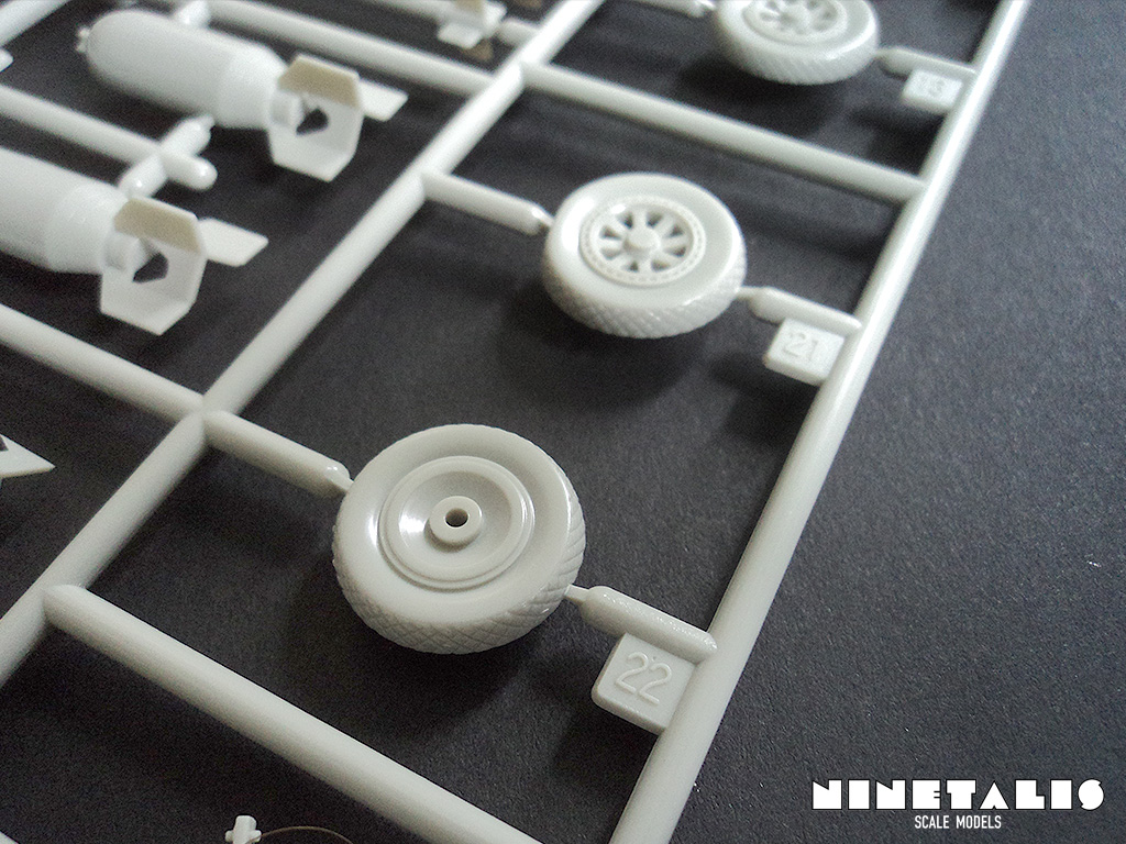 The fourth and final styrene sprue can be found twice inside the kit, and holds the wheels as well as all the external armament, like several types of drops tanks (65, 108 and 150 gallon), 5-Inch HVAR’s (High-Velocity Aircraft Rocket), 4.5″ M-10 “Bazookas” and 500 and 1000 pound bombs. This means that no matter what you build, you will always end up having a few spares to keep for the future, which is a nice additional bonus to the kit itself.