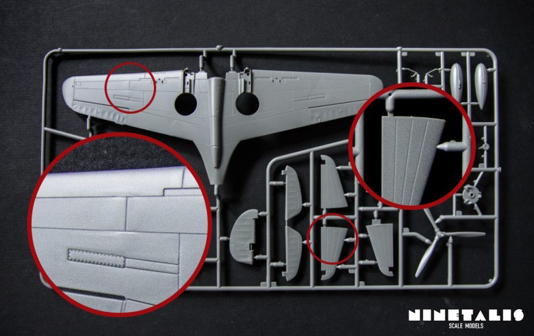 The only drawback on this frame is that the wheel wells suffer from what seems to me as a design flaw. Not only are there ejector pin marks in the middle of the wheel well, we can also find what seems to be a deformation of the plastic due to the bar connecting the two wheels wells together. Luckily most P-40B wheel wells were covered with textile and this can be somewhat worked around and hidden as such. Maybe this was even what the designer was going for, although in that case I don’t think the desired effect was achieved. Either way once build this will also be hidden by either the tires when build wheels up, or by the fact that the wheels well are naturally found on the bottom side of the aircraft.