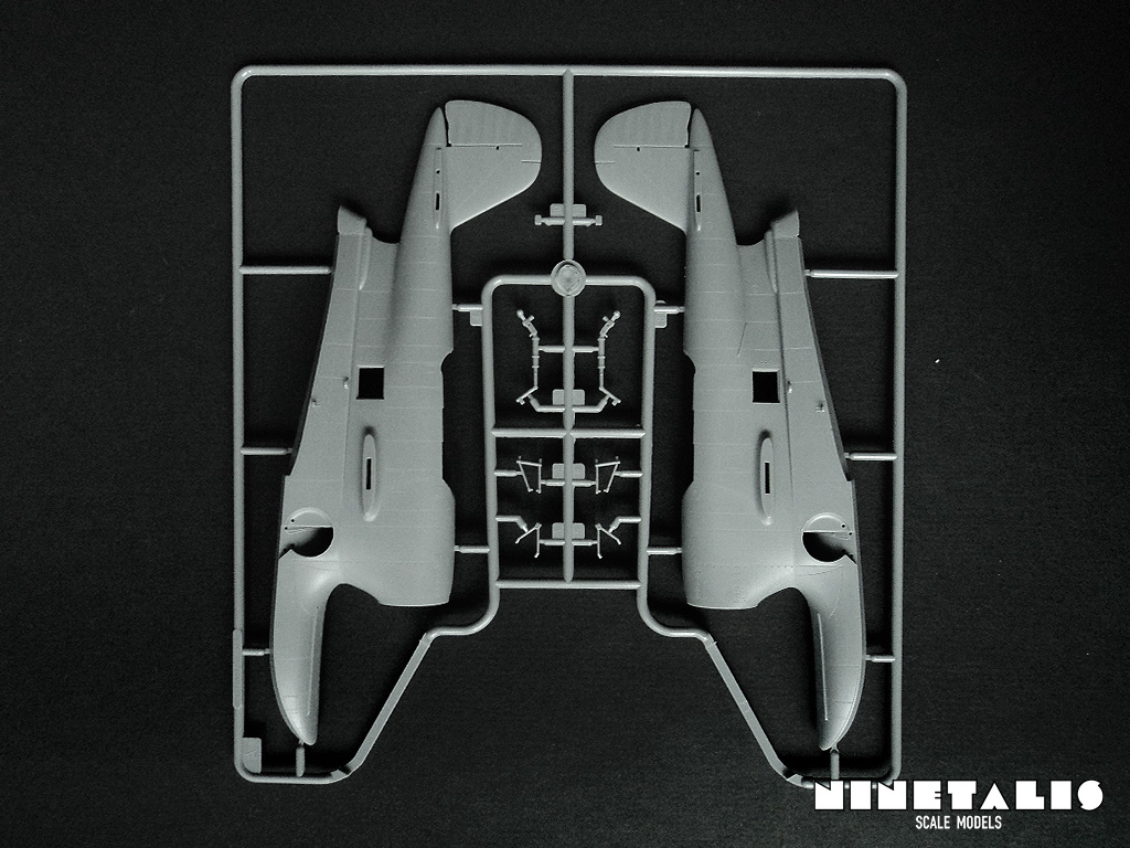 It might sound odd but the A sprue is split in two frames. The first frame holds parts one to eight (and ten), which consists of the fuselage halves and the main landing gear. The second frame just holds one single part (part number A9), which is the engine cowling. Both frames feature sharp details like recessed rivets and panel lines, as well as fuselage spars on the inside where the cockpit will go.