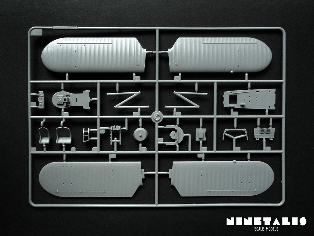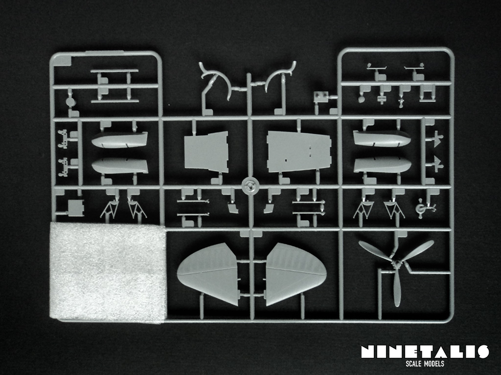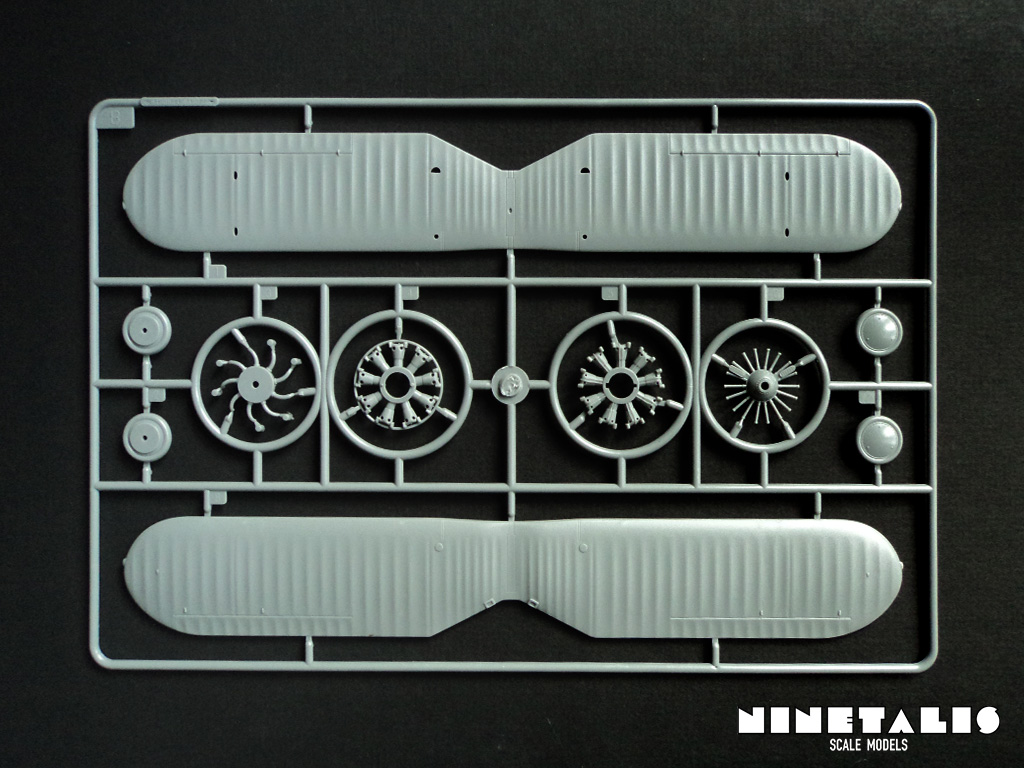 The second sprue holds the upper wing parts, engine parts and the landing wheels. The engine is divided into seven parts, of which four can be found on this sprue. Fine details can be found on the cylinders as we should be able to expect from a new tool of this age. However, since they are split into a forward and aft part, the builder might need to clean this up a little bit if he or she desires to display the engine. The wheels also feature some fine details in the form of both raised and recessed rivets.