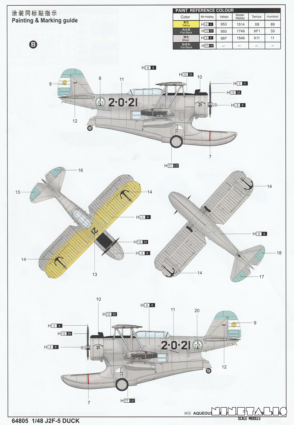 The second set of markings depict a Argentinian aircraft in overall silver and a yellow top wing with a black anti glare panel. The Argentinians acquired 24 ex-US Navt J2F-5’s in 1946–1947, together with one J2F-4 and seven J2F-6’s to add to their four 1937 J2F-4’s and eight 1939 JF-2’s.
