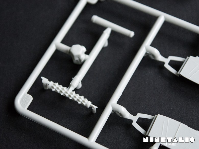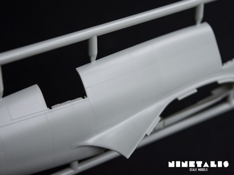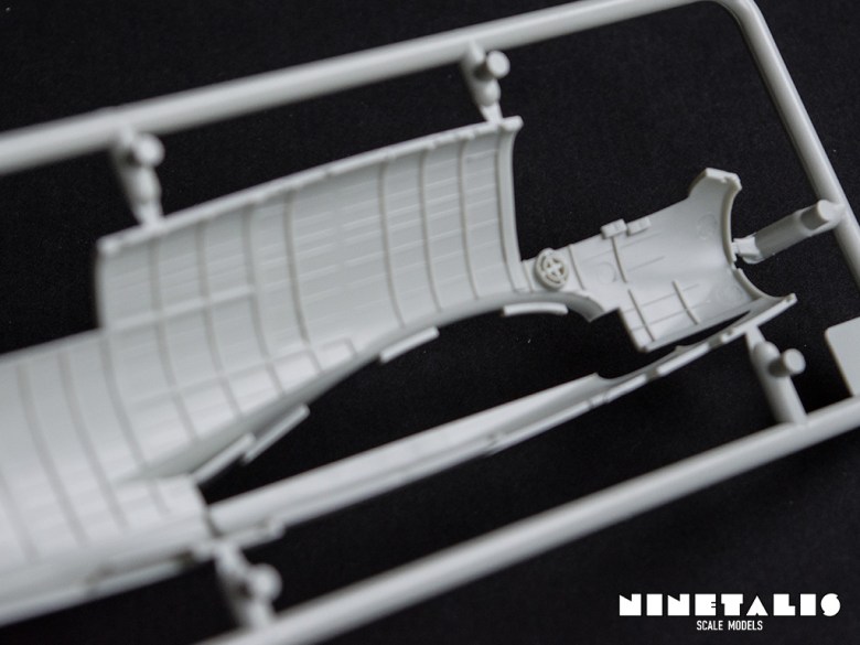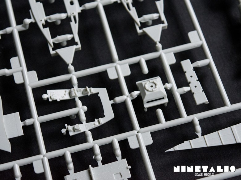 Our final bag holds no less than 7 frames, most of which are small and hold no more than one to five parts. They comprimise the two fuselage halves, horizontal stabilisers, a torpedo, the dorsal fin and a nose cone. While detail here is fine on the parts, I did find some flash on the fuselage halves and some rather outspoken molding seams on various small parts. Thankfully most of this can easily be dealt with or is found in areas which will be hidden away once the model is completed.