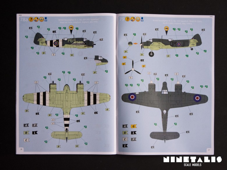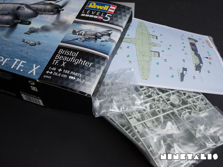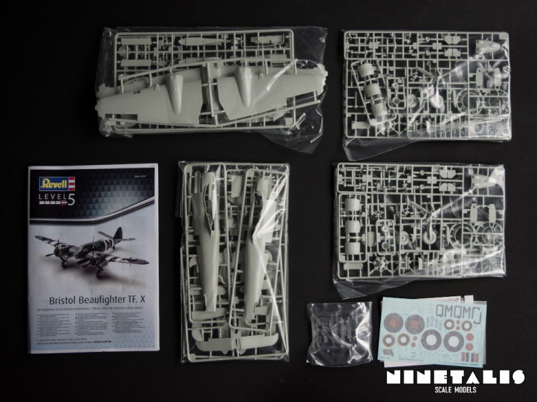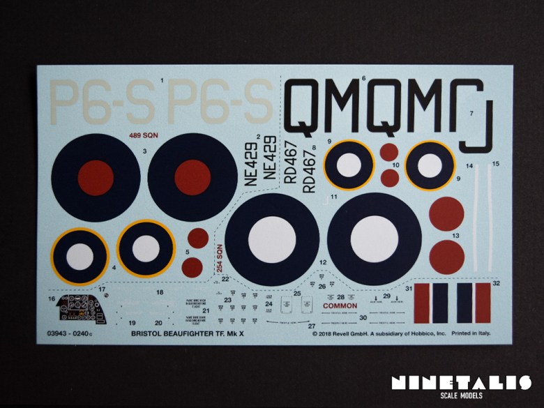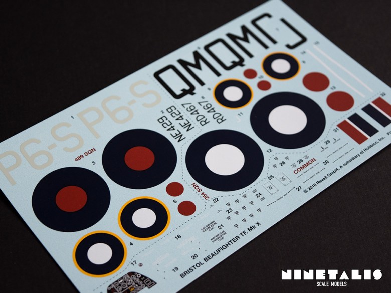 I must say that I find the set of markings provided rather dull, as the Mk. X was one of the most widely exported Beaufighter variants. There are dozens of interesting markings like aircraft from operation Firedog in Malaya, (converted Mk. X) target tugs, Turkish AF, Portuguese AF, Israeli AF, Dominican AF or even the full green or brown on brown camouflaged Australian RAAF machines. This is easy for aftermarket decal printers to fix, yet still I find Revell’s choice a bit disappointing in this regard.