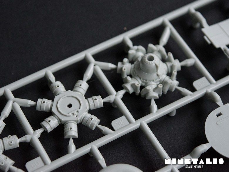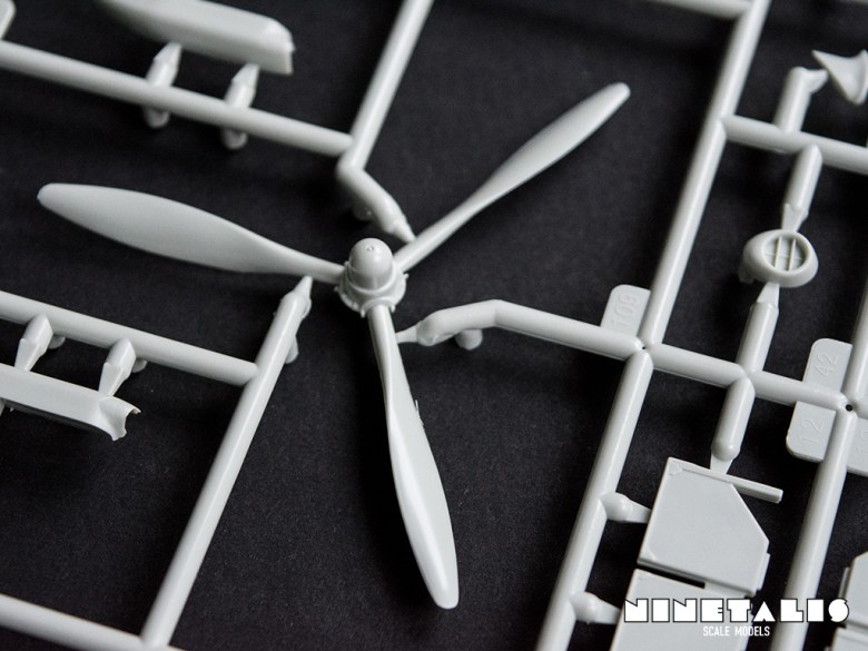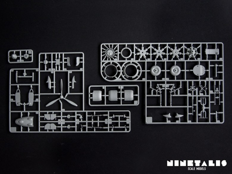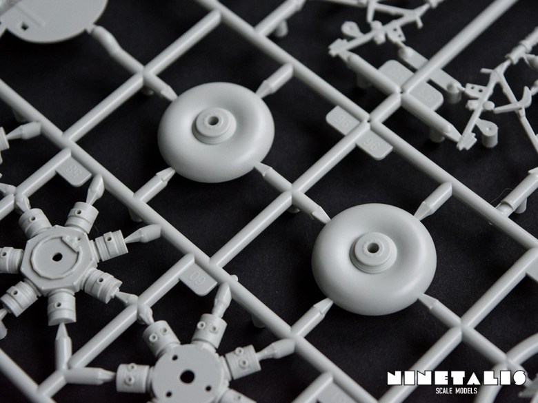 The next four frames are provided twice in the kit, and consist of items like the wheels, landing gear, engines, propellers, prop hubs, exhausts shrouds and engine covers. Again the detail here is very fine and crisp, but some tiny bits of flash and seam lines can be found here and there.