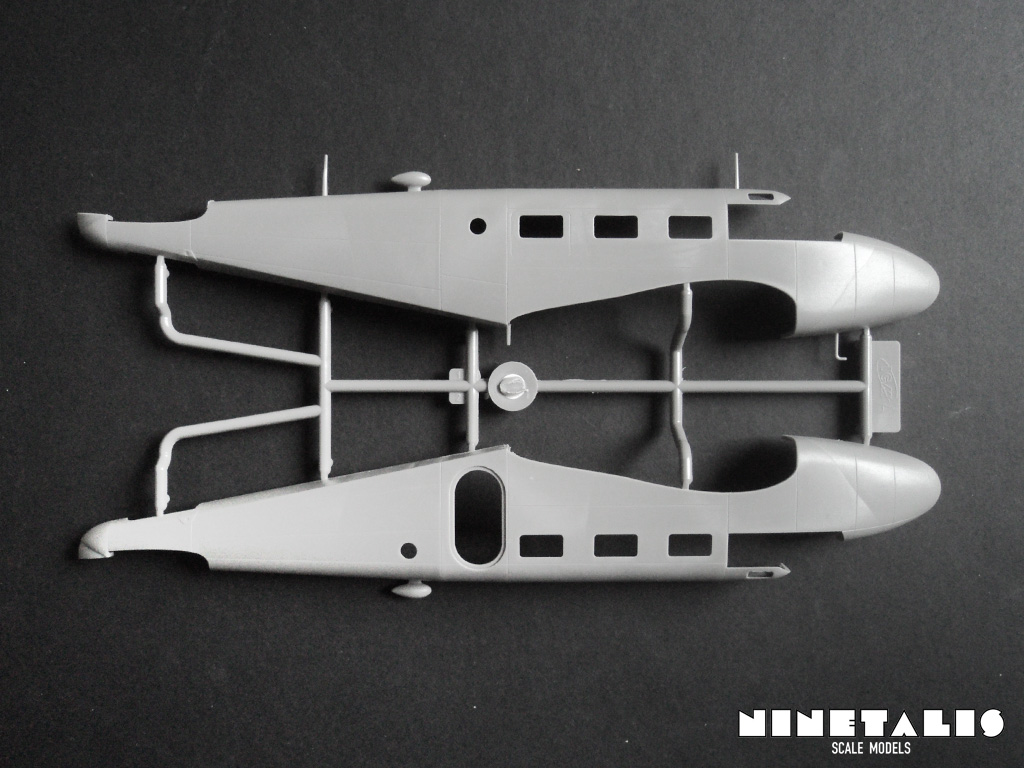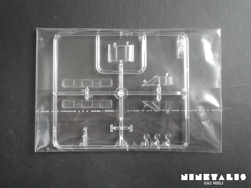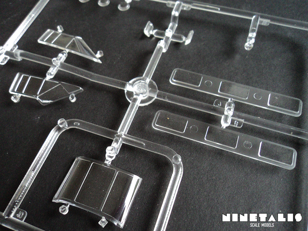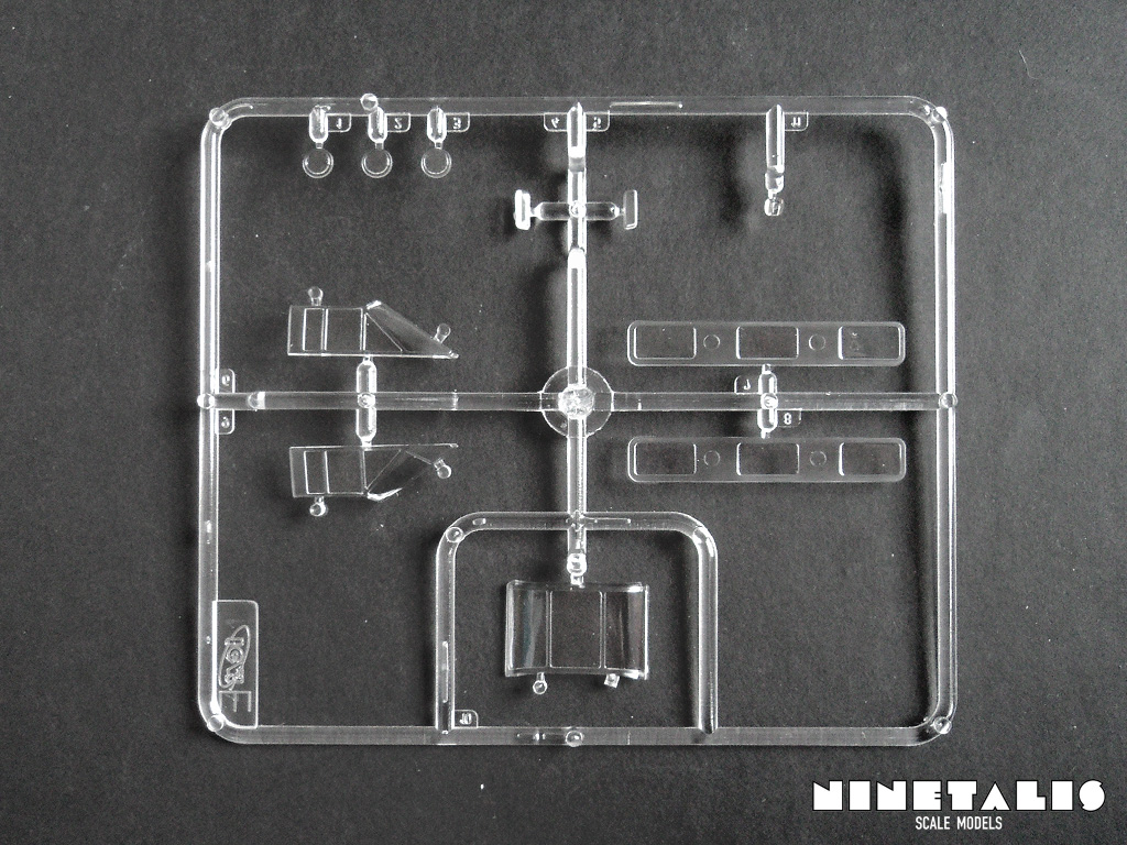 On the clear sprue we can find ten parts. The cockpit windows are split up in three parts, one front windshield and two for the sides. We also have two parts for the square side windows for the passenger compartment, together with a few round windows and other parts that go all around the airframe.
