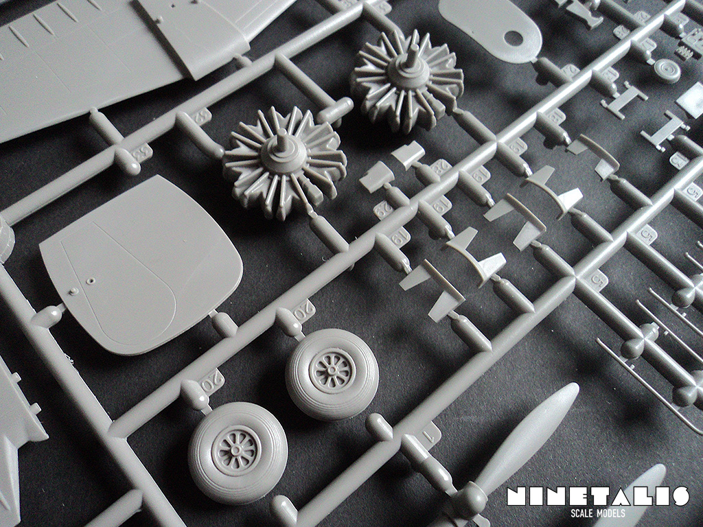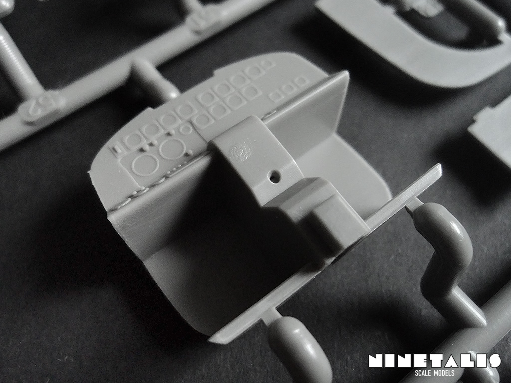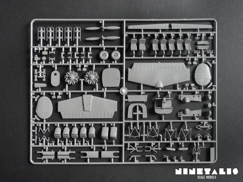 The D sprue is the only big frame we get with this kit. It features pretty much all the details of the kit like the wheels, seats, instrument panel, propellors, engines and many other things. Although that overal the parts are well detailed, it is quite clear that they could be better. The biggest annoyance with the kit must be the undetailed engines, which don’t even feature any detail on the cilinders housings. As the parts for the inside are not very detailed as well, it shouldn’t be the biggest of problems as you won’t be able to see much of it once completed.