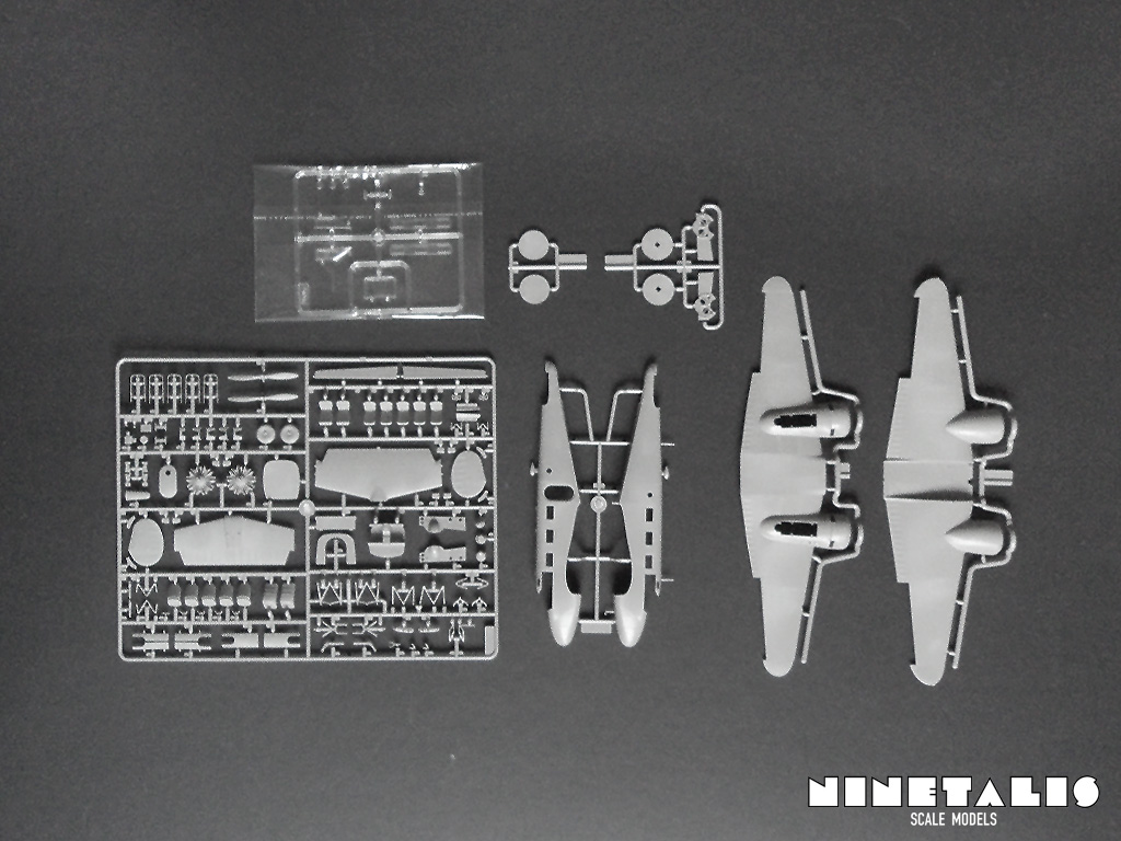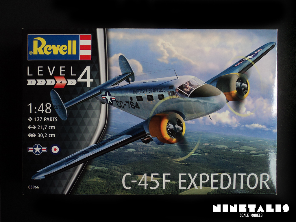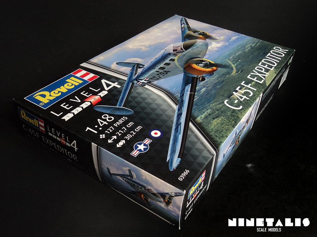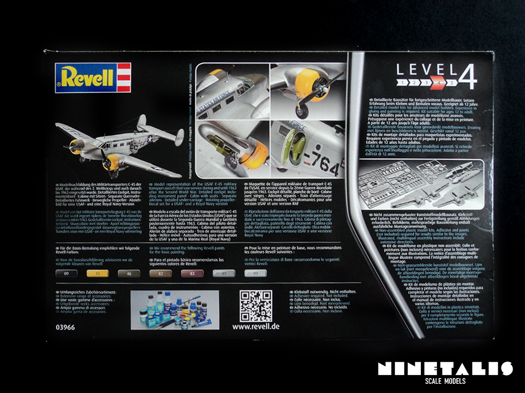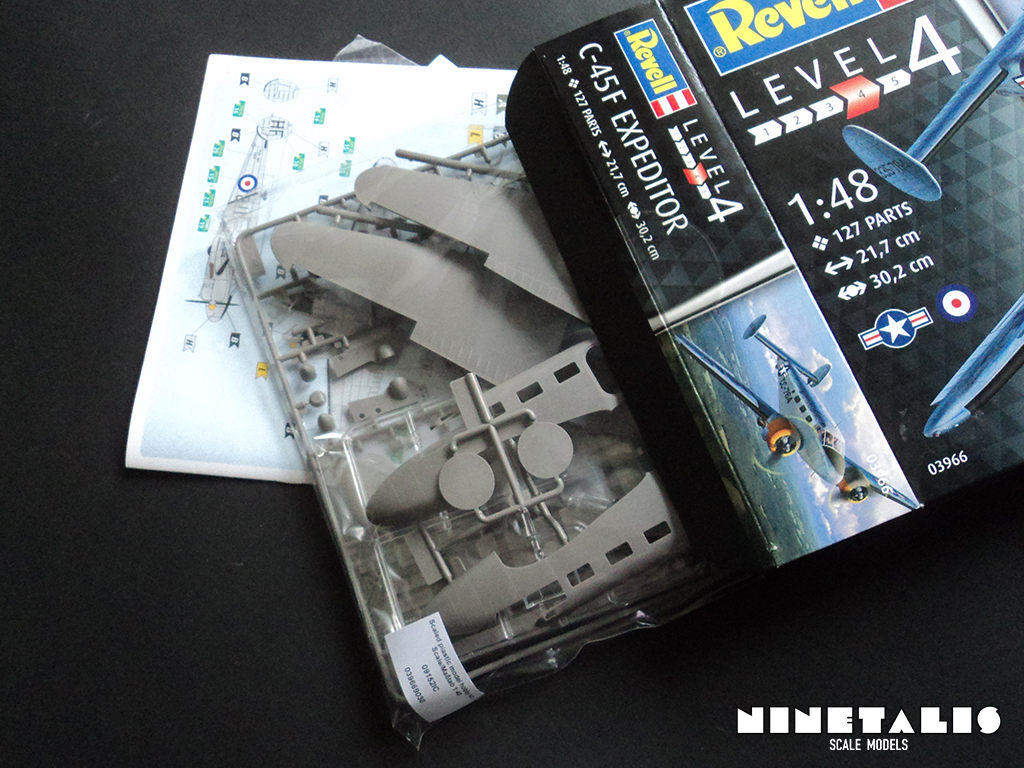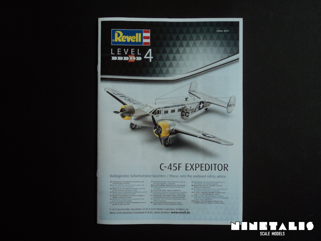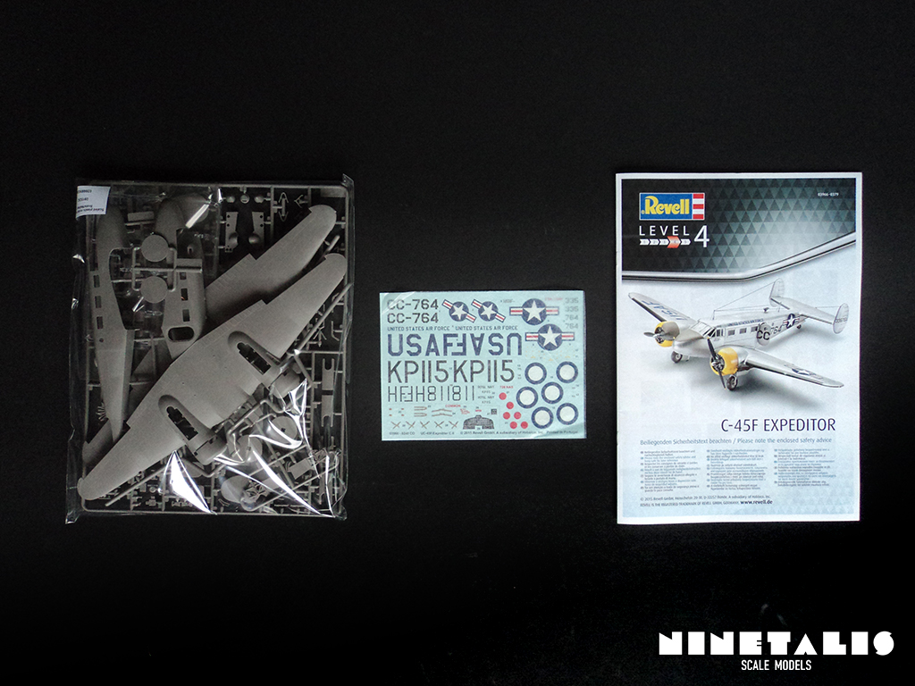 Above we have one of the first releases from Revell since they introduced their new boxings. But not only the box’s style is different, the instructions leaflet is completely different as well, with (for the first time) colour printed instructions. As some might already know, this kit is a reboxing of ICM’s recent C-45F kit but with a few distinctive differences. It offers different markings and as such different decals, at a lower price than the original kit. So what else do get when getting this kit? Well, Inside we can find a total of seven frames, carefully wrapped in plastic foil. The clear sprue has been packed individually inside the foil packing all frames. Last are the Instructions.