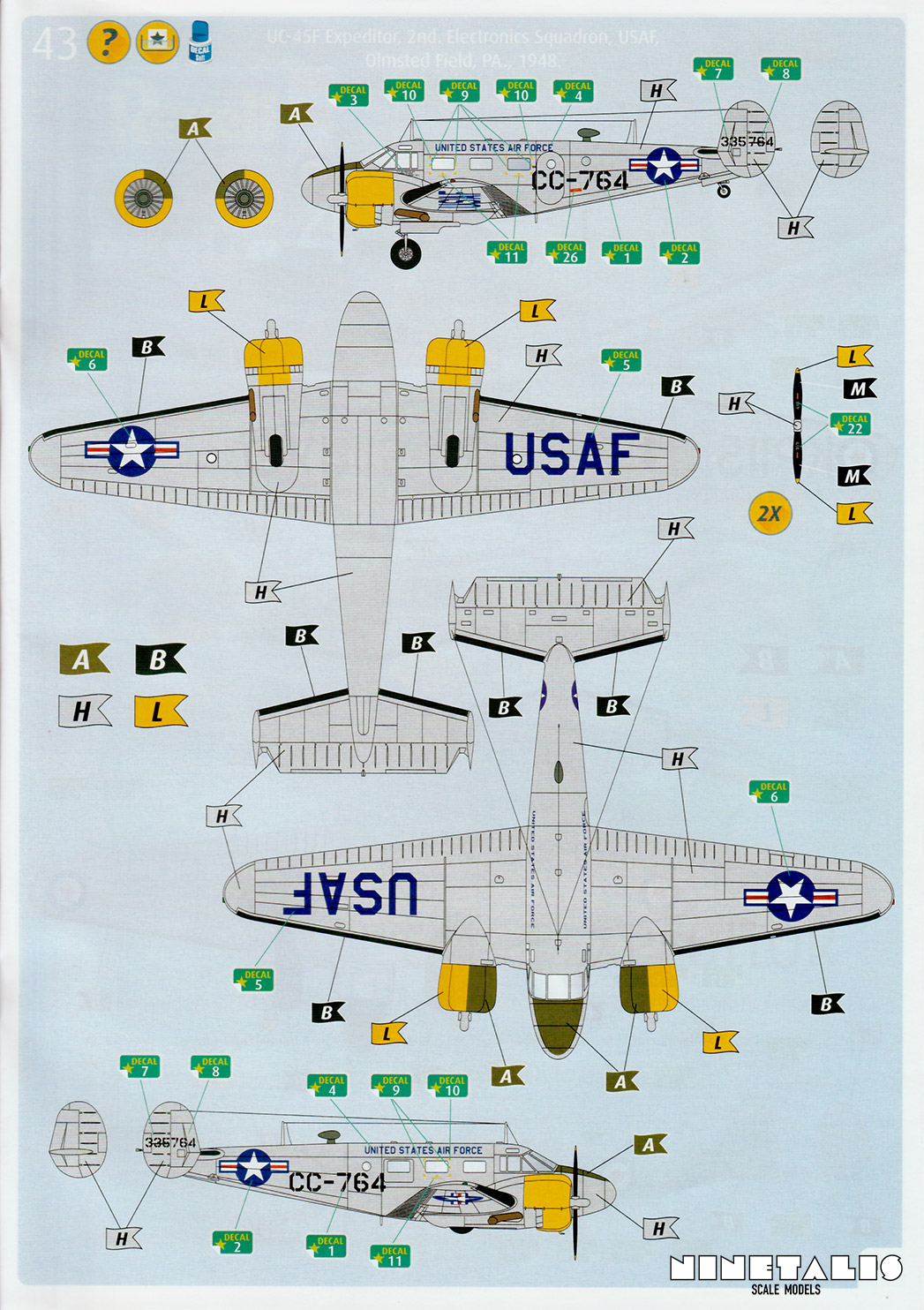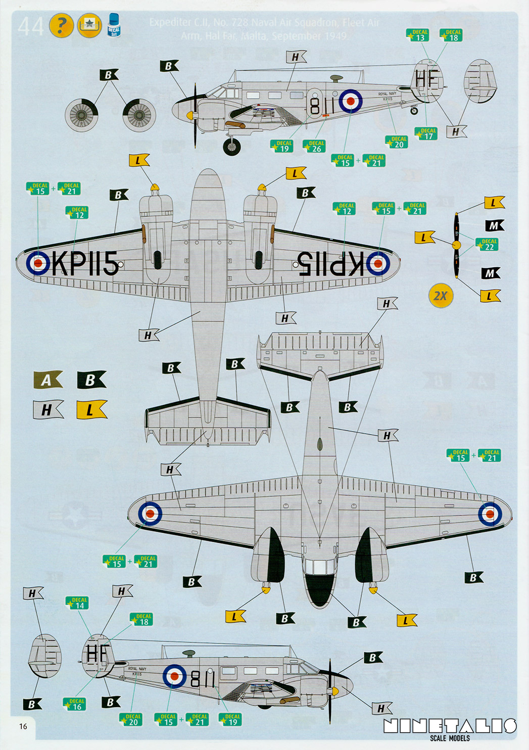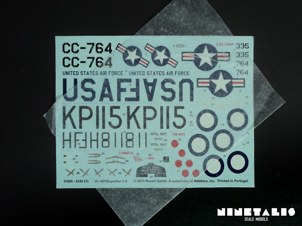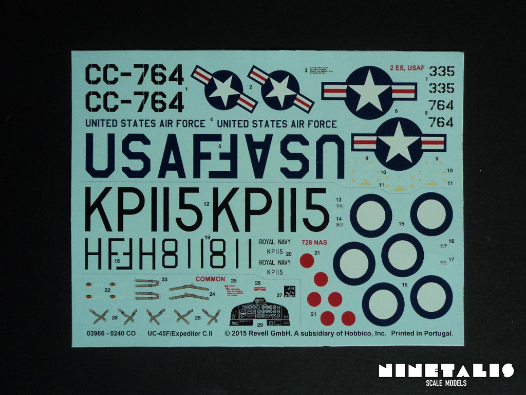The second aircraft is an Expeditor C.II from the No 728 Naval Air Squadron of the Fleet Air Arm, based at Hal Far, Malta in September 1949. The RAF aircraft is painted in exactly the same way as the provided USAF airframe except for two things, which are the lack of the yellow engine cowlings and the anti glare panels which are painted black instead of olive drab. On the bottom surfaces of the wings we can find the black identification codes as well as on the vertical stabilisers.