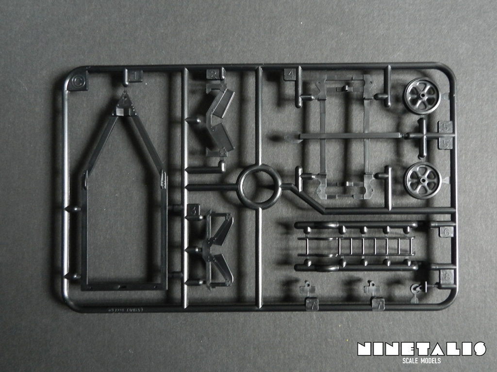 The final styrene sprue holds all of the parts that don’t go on the aircraft itself. This might sound odd for an aircraft kit, but one must remember that this is a floatplane, which often couldn’t stand on its own once on land. For this, Tamiya has provided a cart which were used in real life to move the aircraft about once it was moved or stored on land. On the sprue we can also find a ladder, which were also specially fabricated for the N1K1 so the pilot could climb aboard the aircraft right behind the center wings.