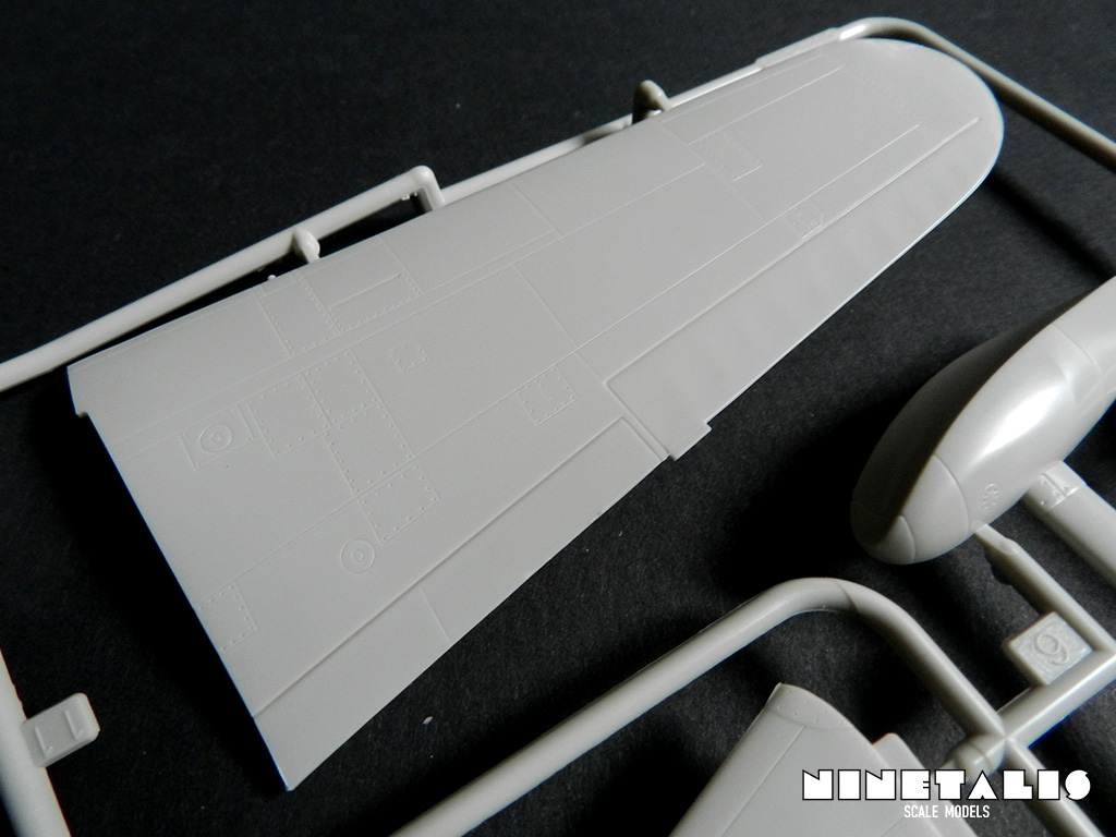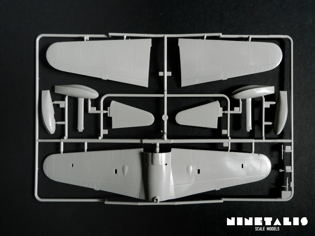 The A sprue holds the internal parts and all external parts aside from the wings, the outer floats and horizontal stabilisers. The parts contain fine details, like recessed rivets and panel lines. The cockpit also features fine details like small buttons and recessed instruments on the instrument panel. On the inside of the fuselage halves (of which one is molded on a separate sprue) are raised stringers and chords to depict the details on the cockpit walls.