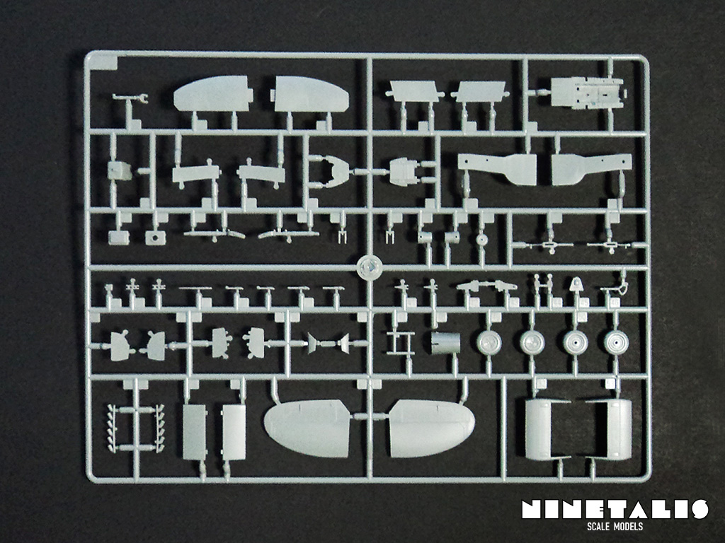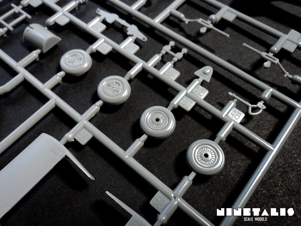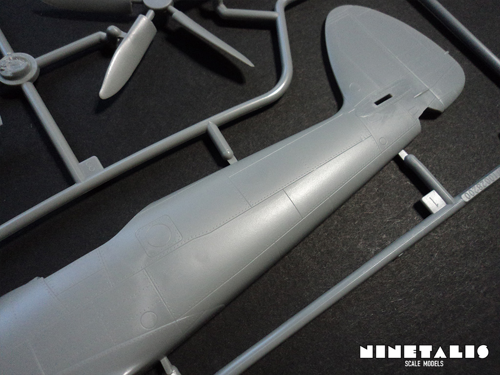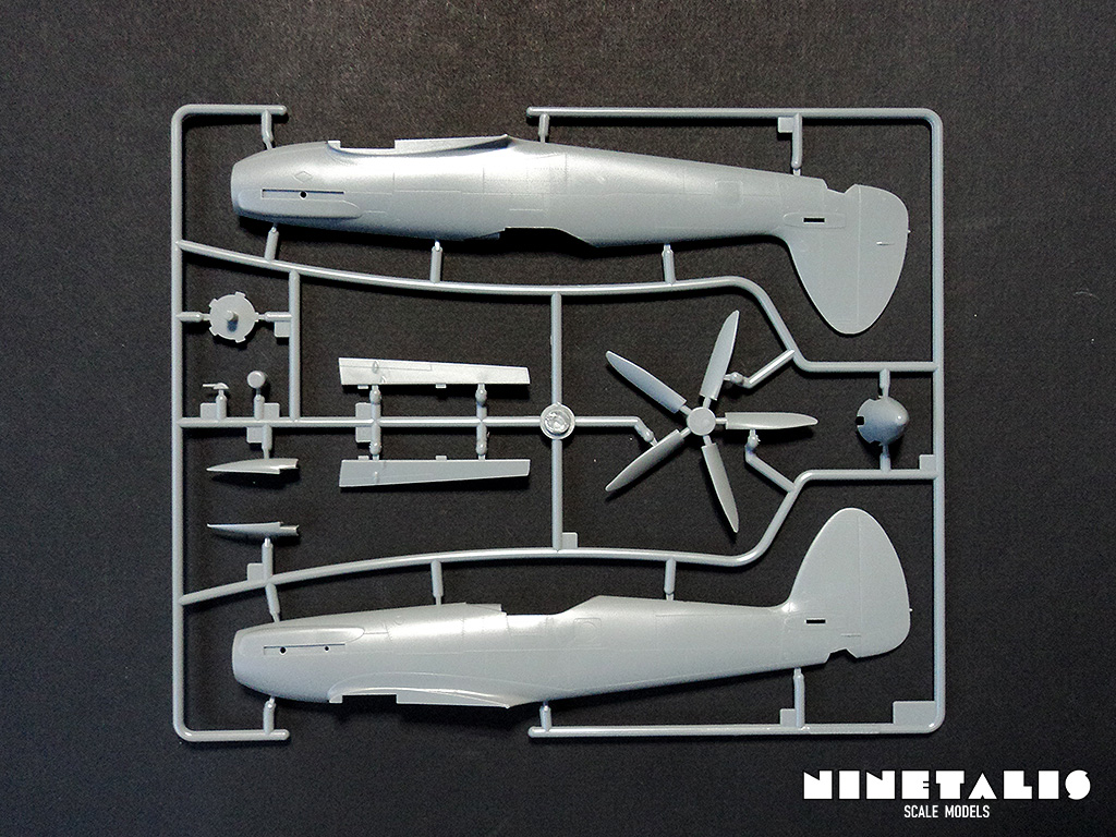 The first sprue features both fuselage halves, ailerons, intake cover and the propellor and spinner parts. The ailerons and fuselage halves feature fine recessed panel lines as well as recessed rivet marks. The only downside here are the sprue attachment points on the fuselage halves, as they are rather thick at certain places and need a steady hand to remove from the parts without leaving marks. Same goes for the propellor, as the attachment point are placed on the blades instead of the center point, which would be hidden underneath the spinner once completed.