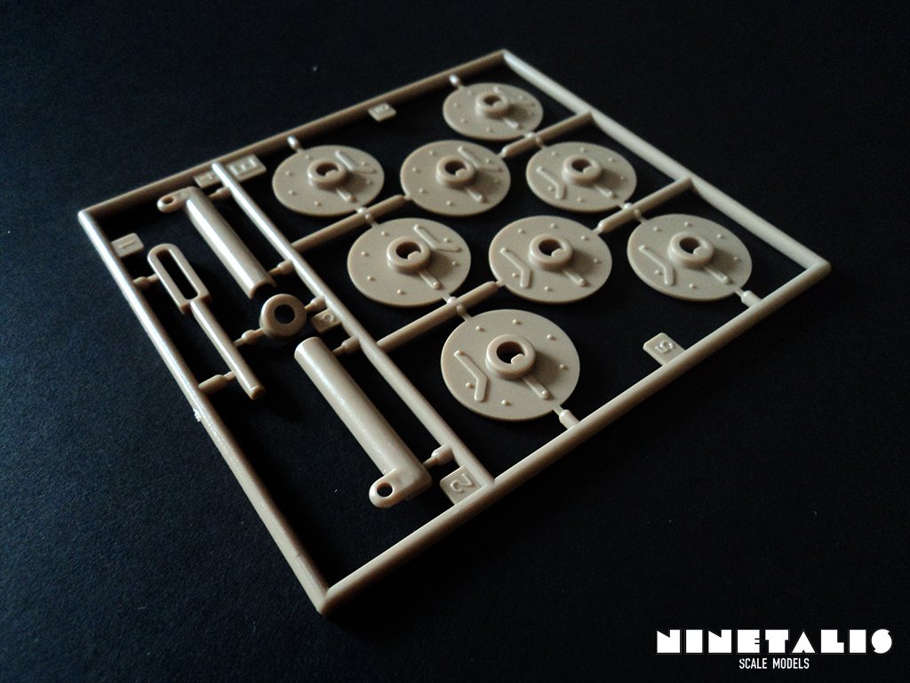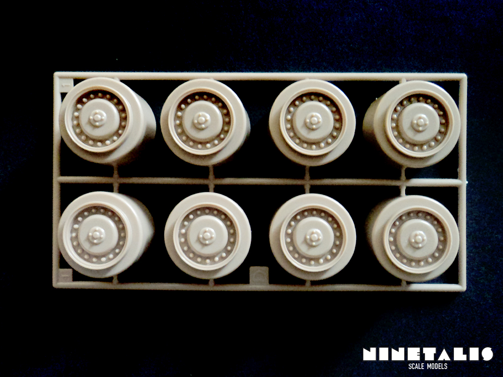 Inside the kit you can find 8 molded rims, which have 8 accompanying rubber tires. The rims come quite close to the real deal, as can be seen on the pictures below. The tires on the other hand do not and don’t seem to resemble the real tires at all. Also the rubber itself feel more like some sort of gell and are not matte like the tires that we usually find with most kits. They are however quite bendable, which does add a touch of realism. It’s a bit sad they didn’t get the tread pattern right or at least something more realistic than this, because it would not have been hard. I’m not aware if there any after market replacements in 1/48 scale but I doubt that any will ever be released.
