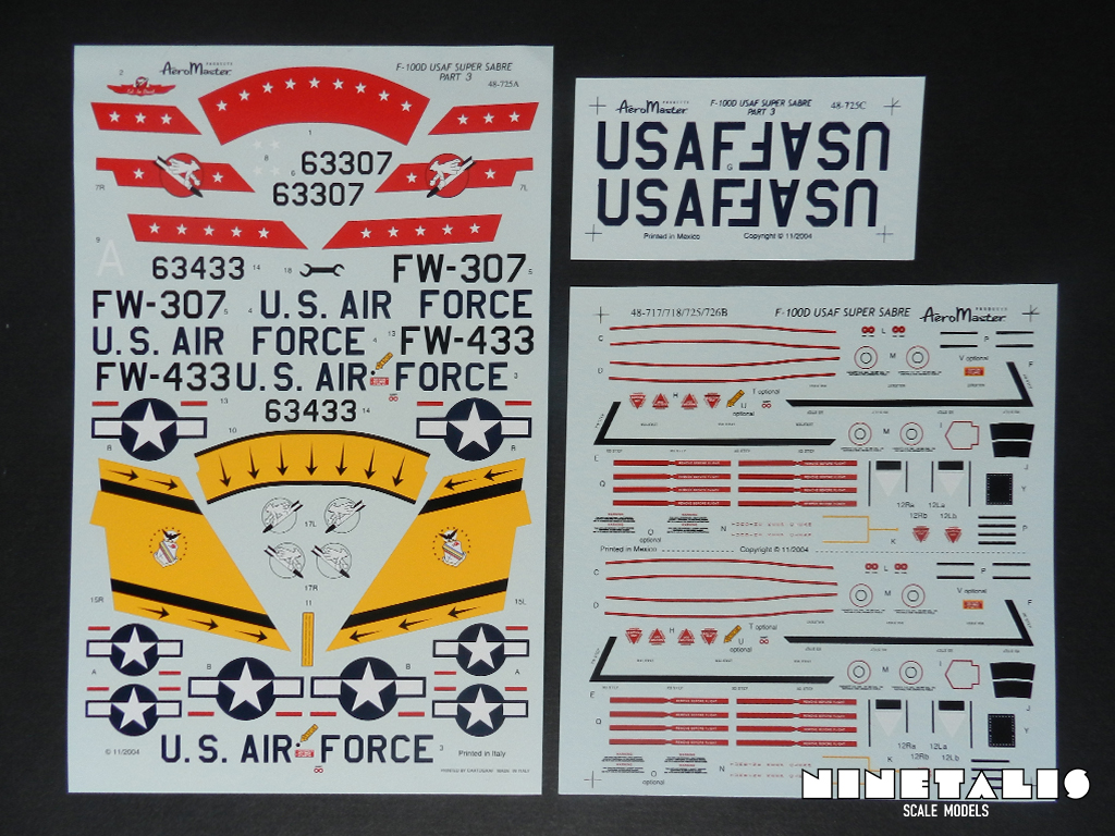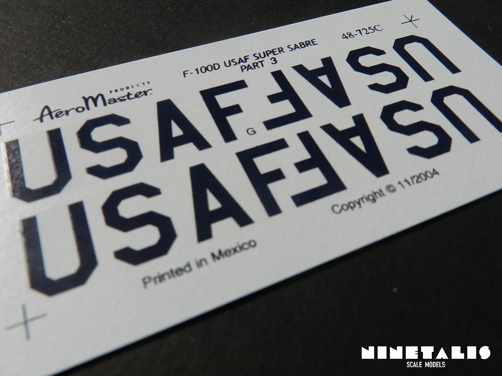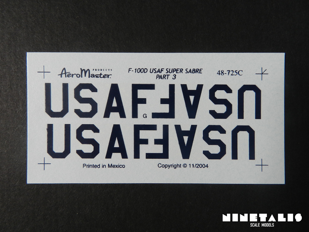 The third sheet is really small compared to the others. This one holds the ‘USAF’ codes for the wings in insignia blue. For those who wonder, each four USAF letters are combined into one large decal. Like the last sheet, this one is also printed in Mexico and also seems to be from great quality like the others.