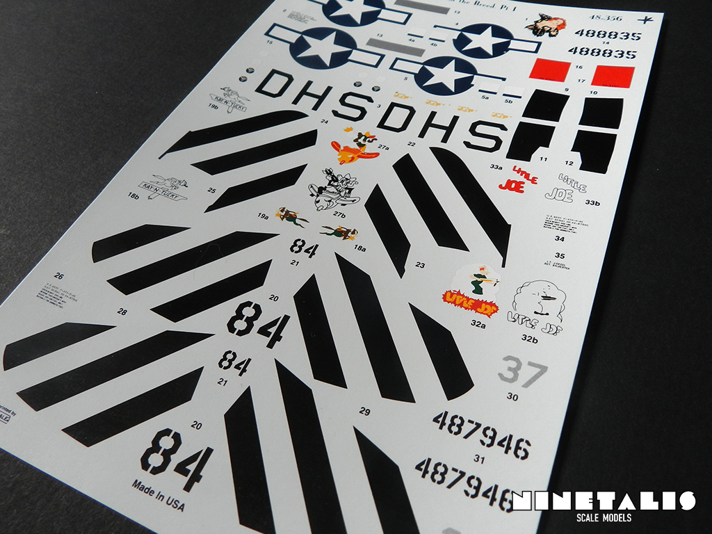 The decals were designed to be used with the Minicraft and Monogram kits. I used them with the Academy kit and this did not pose any problem, as this is most likely a rebox from the Minicraft kit. The decals are of very good quality and silvering seems to be minimal. The designs are very detailed and some of the cartoons are divided into two decals, one being the outlines while the others represent the colors. On the decal sheet it states that the decals are printed in the USA.